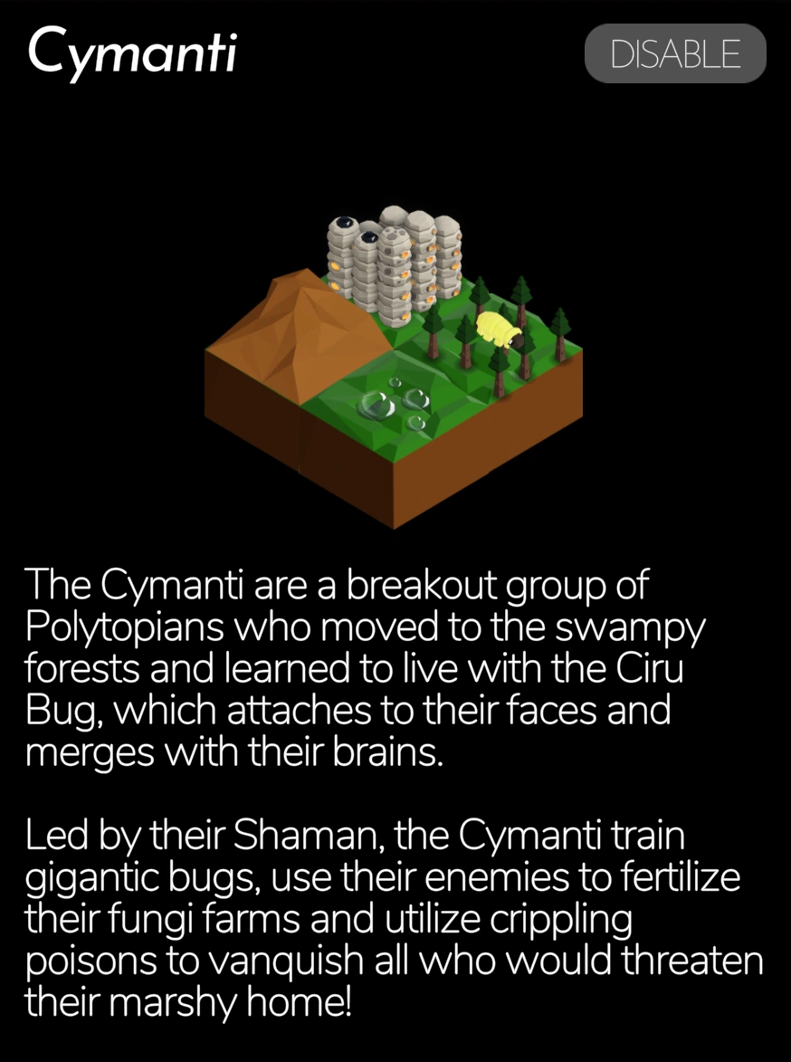 The Cymanti are a breakout group of Polytopians who moved to the swampy forests and learned to live with the Ciru Bug, which attaches to their faces and merges with their brains. Led by their Shaman, the Cymanti train gigantic bugs, use their enemies to fertilize their fungi farms, and utilize crippling poisons to vanquish all who would threaten their marshy home!
